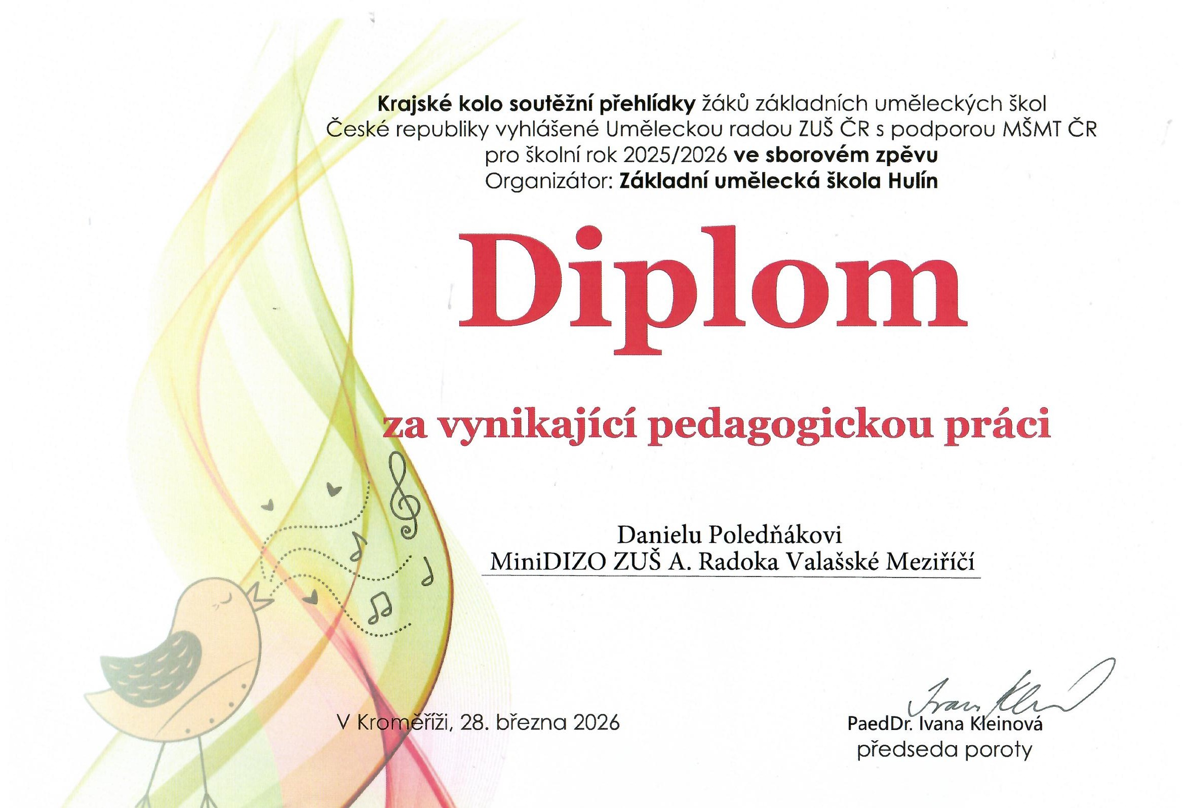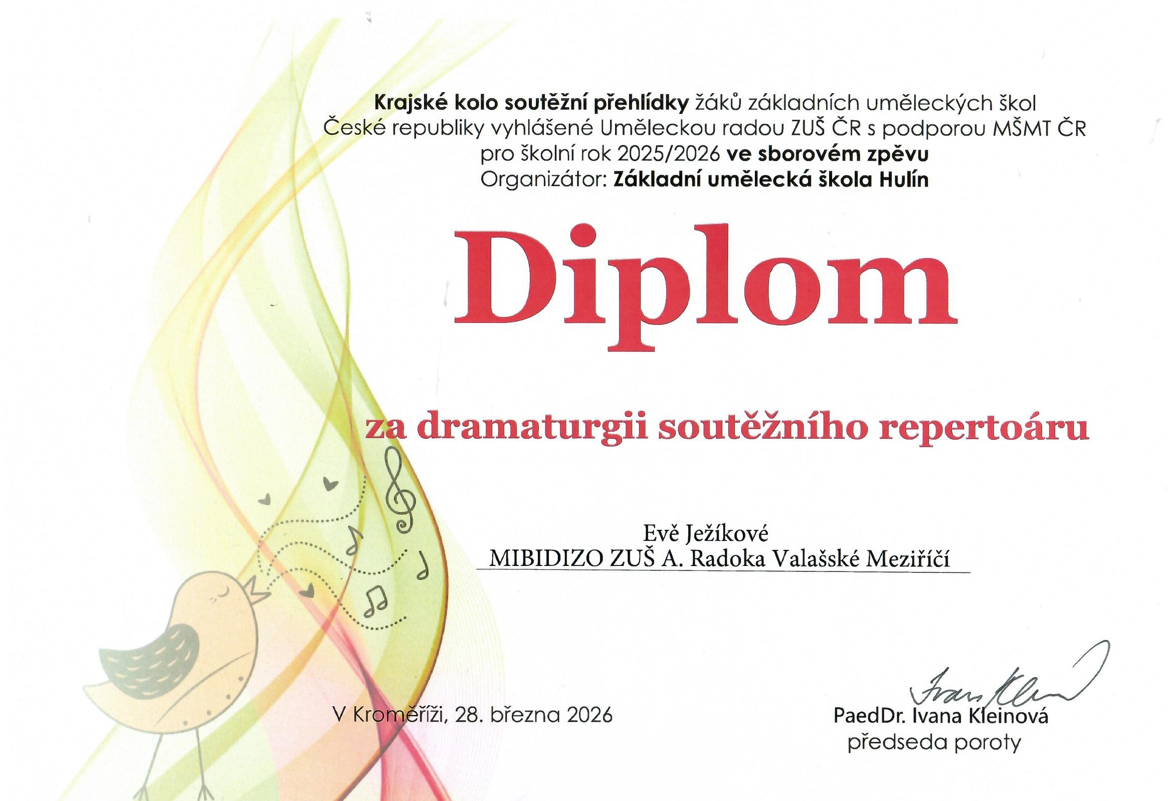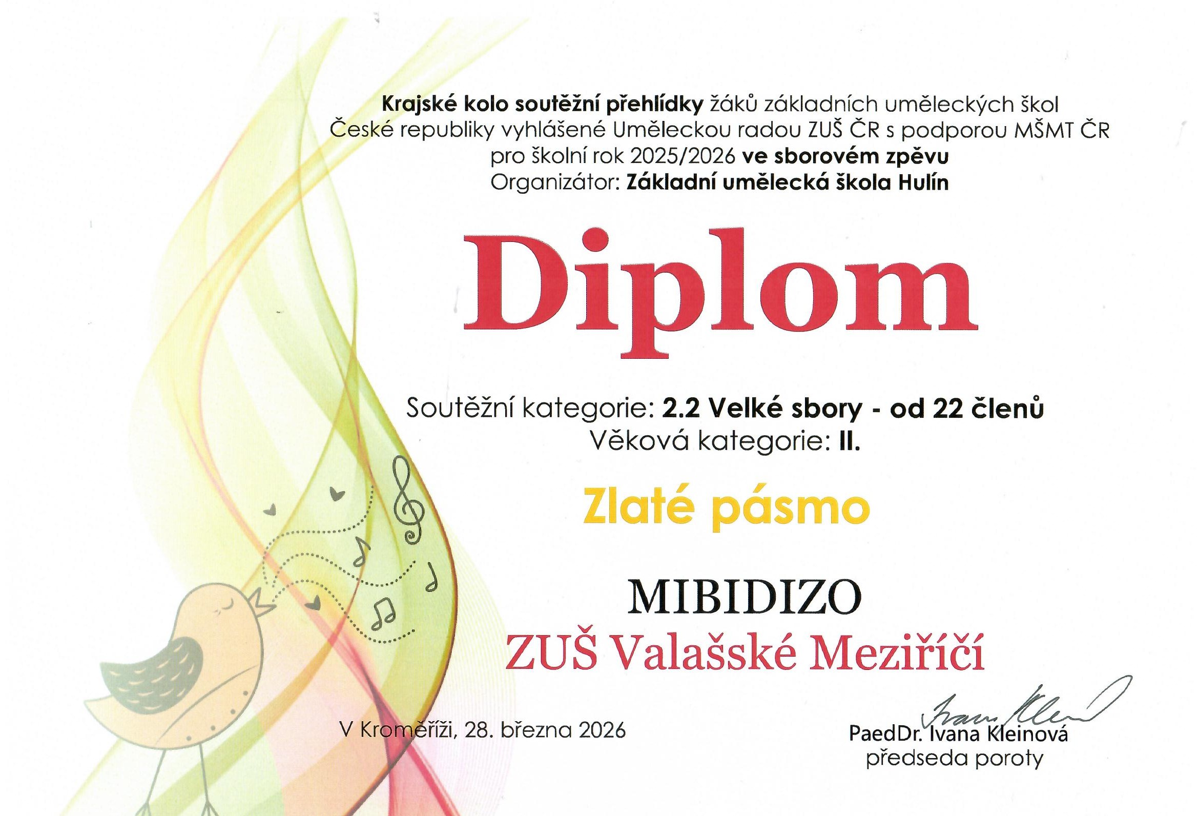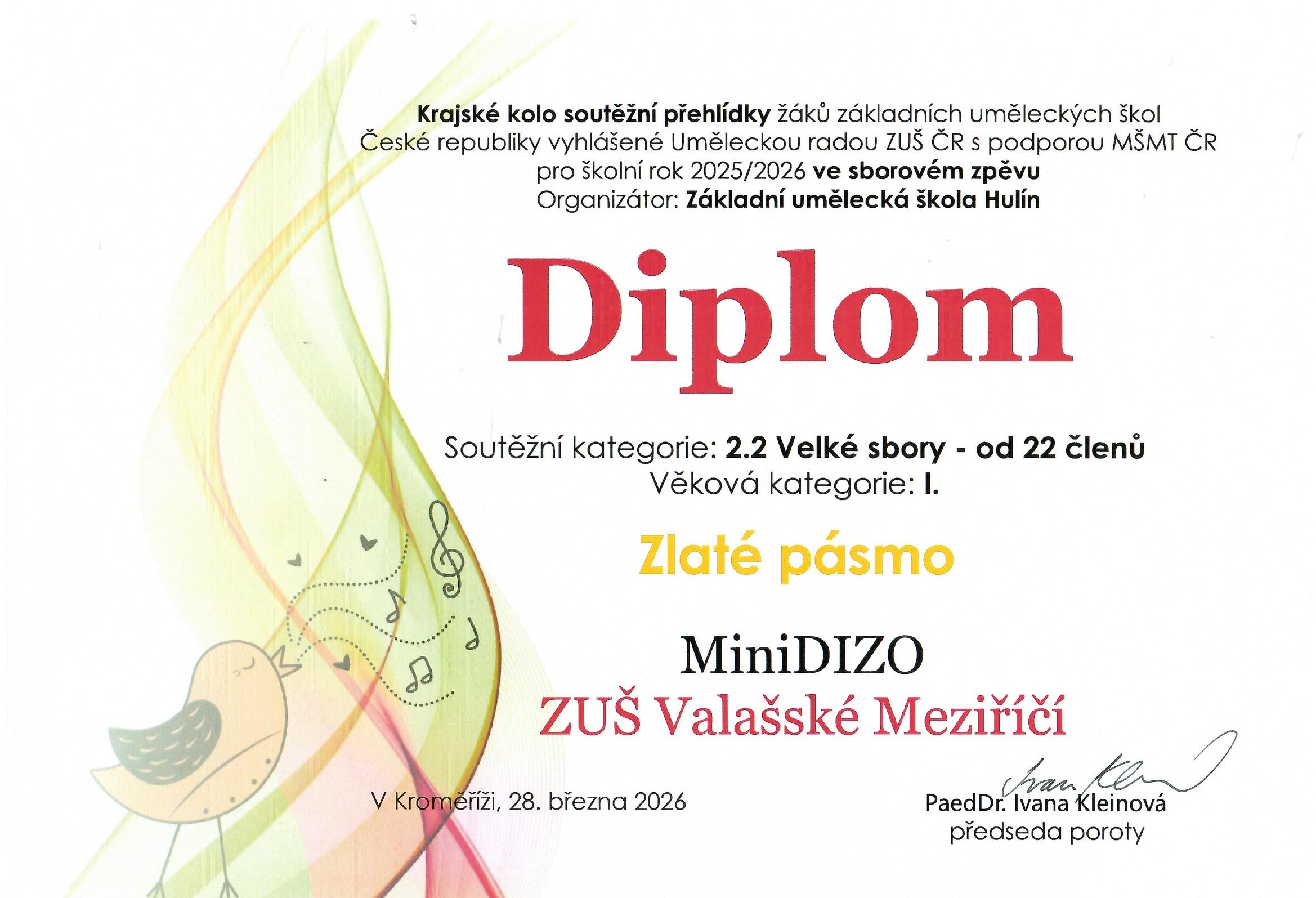V sobotu 28. března 2026 se našim zpěváčkům z pěveckých sborů MIBIDIZO a miniDIZO velmi dařilo na krajském kole sborové soutěže v Kroměříži, kterou pořádalo MŠMT. Oba sbory si vyzpívaly ZLATÉ PÁSMO. Navíc MIBIDIZO postoupilo do celostátního kola soutěže. Sbormistryně Mgr. Eva Ježíková získala ocenění za dramaturgii soutěžního repertoáru a sbormistr MgA. Daniel Poledňák získal ocenění za vynikající pedagogickou práci. Všem moc gratulujeme a přejeme mnoho dalších úspěchů!