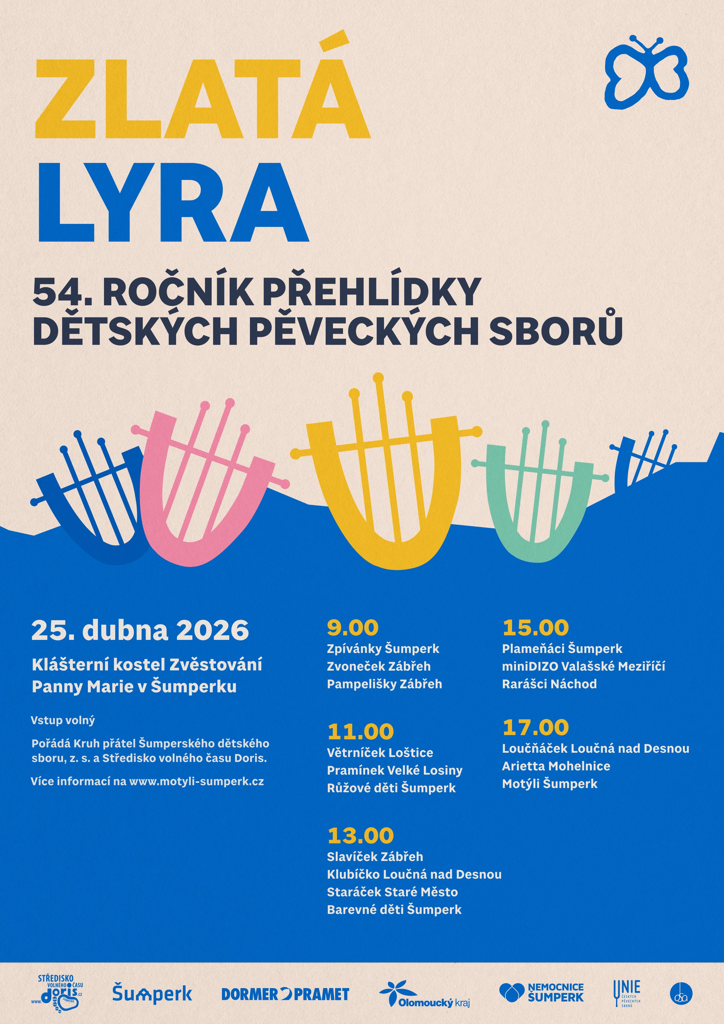 V sobotu 25. dubna 2026 se naši zpěváčci z pěveckého sboru miniDIZO zúčastní přehlídky dětských sborů Zlatá lyra 2026, která se uskuteční v Klášterním kostele Zvěstování Panny Marie v Šumperku. Jedná se o kostel, který koncertním vystoupením dodává slavnostní nádech. Vystoupení až dvaceti dětských sborů mateřských, základních a středních škol zazní během jednoho dne na čtyřech či pěti festivalových koncertech. Na závěr každého koncertu zpívají sbory společně. Než však k tomu dojde, poslouchají sbory navzájem svá vystoupení. Všechny festivalové koncerty sleduje tříčlenná porota, ve které jsou zastoupeni kolegové a kolegyně sbormistři, odborníci na sborový zpěv. Zlatá lyra není soutěžní přehlídka. Považuje se však za užitečné a přínosné poskytnout účinkujícím sborům a sbormistrům zpětnou vazbu, která by měla být impulsem a inspirací do další sborové činnosti. Proto po každém koncertě mohou sbormistři s porotci o svých sborech pohovořit.